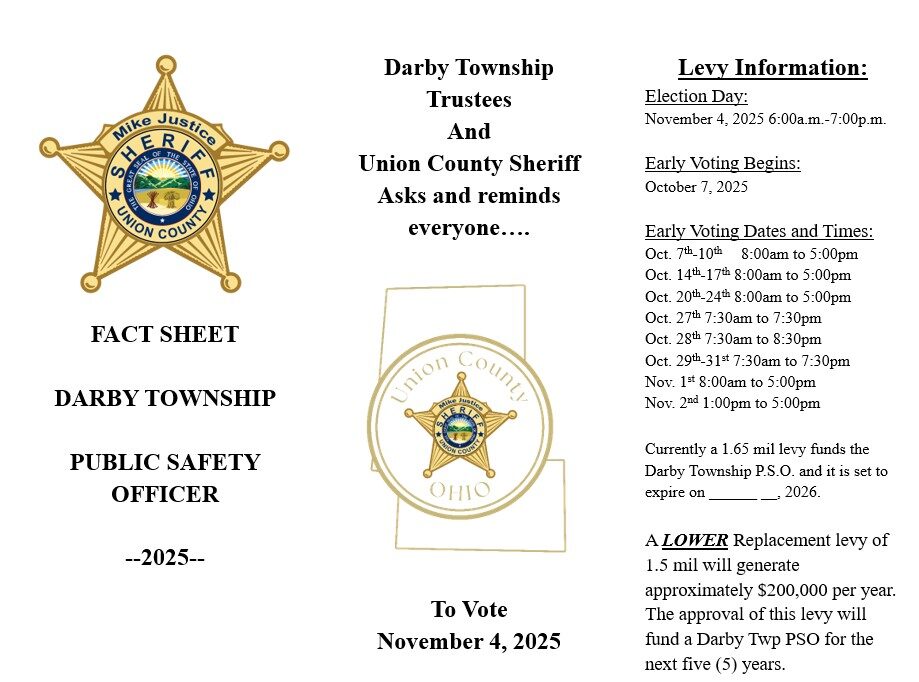 You are invited to participate in the Darby Township “Meet the Candidate” open house on Sunday, October 19th, 2:00 p.m. – 4:30 p.m. at the Darby Township Building, 508 Fourth Street, Unionville Center. All Trustee and School Board Candidates are encouraged to attend to provide the Township residents the opportunity to personally meet each candidate.